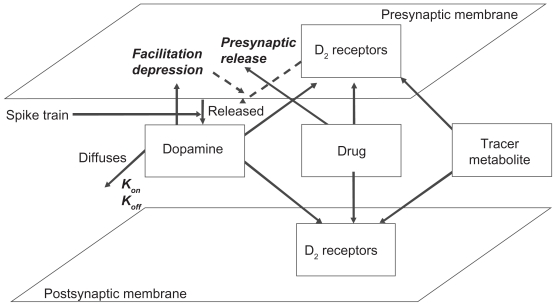 Species differences in physiology and unique active human metabolites contribute to the limited predictive value of preclinical rodent models for many central nervous system (CNS) drugs. In order to explore possible drivers for this translational disconnect, we developed a computer model of a dopaminergic synapse that simulates the competition among three agents and their binding to pre- and postsynaptic receptors, based on the affinities for their targets and their actual concentrations. The model includes presynaptic autoreceptor effects on neurotransmitter release and modulation by presynaptic firing frequency and is calibrated with actual experimental data on free dopamine levels in the striatum of the rodent and the primate. Using this model, we simulated the postsynaptic dopamine D(2) receptor activation levels of bifeprunox and aripiprazole, two relatively similar dopamine D(2) receptor agonists. The results indicate a substantial difference in dose-response for the two compounds when applying primate calibration parameters as opposed to rodent calibration parameters. In addition, when introducing the major human and rodent metabolites of aripiprazole with their specific pharmacological activities, the model predicts that while bifeprunox would result in a higher postsynaptic D(2) receptor antagonism in the rodent, aripiprazole would result in a higher D(2) receptor antagonism in the primate model. Furthermore, only the highest dose of aripiprazole, but not bifeprunox, reaches postsynaptic functional D(2) receptor antagonism similar to 4 mg haloperidol in the primate model. The model further identifies a limited optimal window of functionality for dopamine D(2) receptor partial agonists. These results suggest that computer modeling of key CNS processes, using well-validated calibration paradigms, can increase the predictive value in the clinical setting of preclinical animal model outcomes.